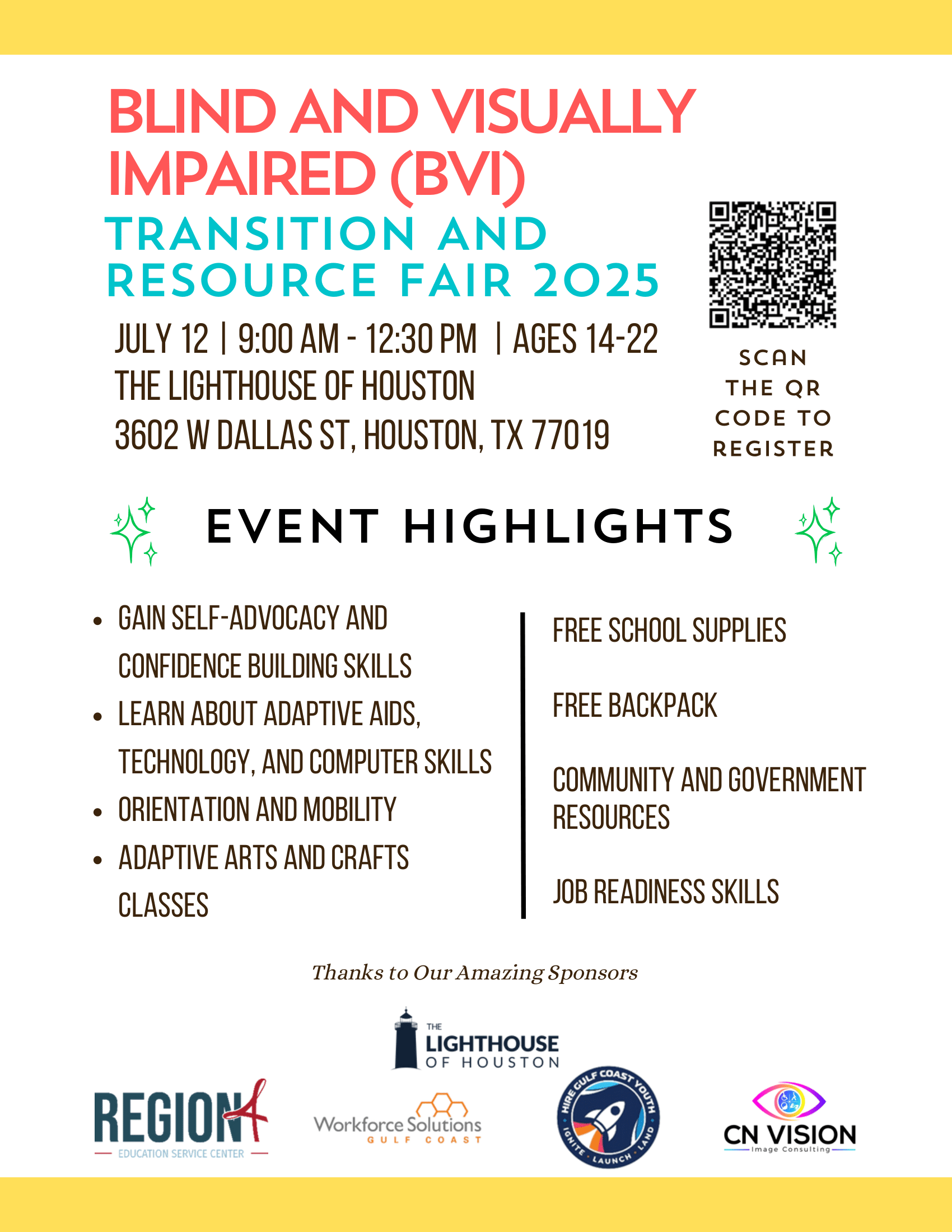 Join us at The Lighthouse of Houston on July 12th from 9:00 AM to 12:30 PM for our 2025 Transition and Resource Fair—a dynamic, hands-on event designed for blind and visually impaired youth ages 14–22. This exciting fair empowers students with essential life skills including self-advocacy, confidence building, job readiness, and computer literacy. Attendees will explore adaptive technology, orientation and mobility training, and even get creative with accessible arts and crafts. The event also features a wide range of community and government resources—all at no cost. Plus, students will receive free school supplies and a backpack! We are grateful to our amazing sponsors who help make this impactful event possible.